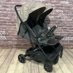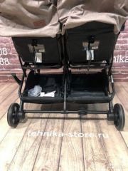 На легкой раме размещено 2 сиденья с независимыми системами регулировки подножек, капюшонов и спинок. Поэтому один малыш может лечь отдохнуть, а второй осматриваться по сторонам. В случае непогоды можно использовать теплые чехлы для ног. В большую корзину можно сложить покупки и игрушки.